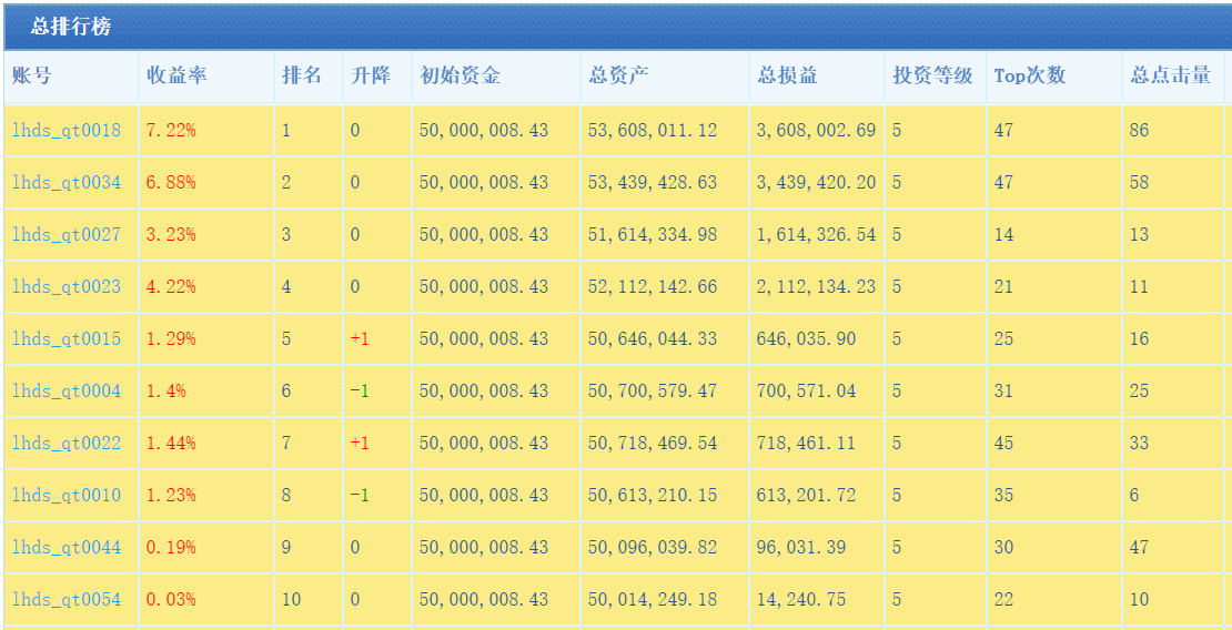 初赛阶段系统按照策略报告和跑盘下单绩效以及操作方式综合排名